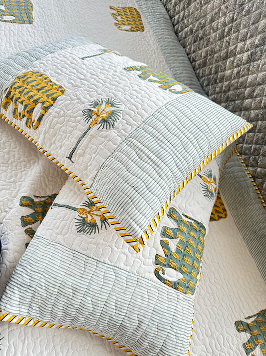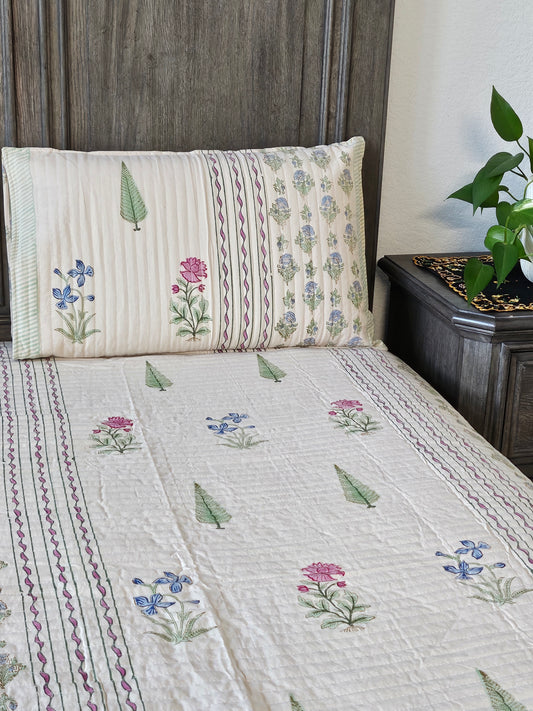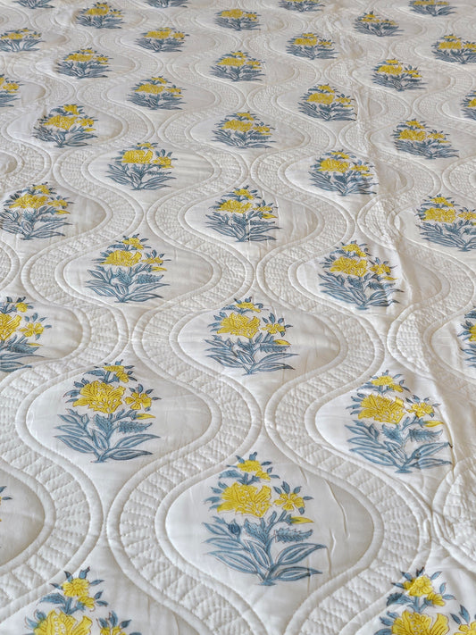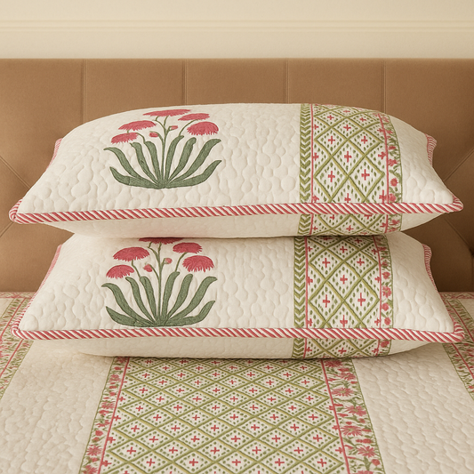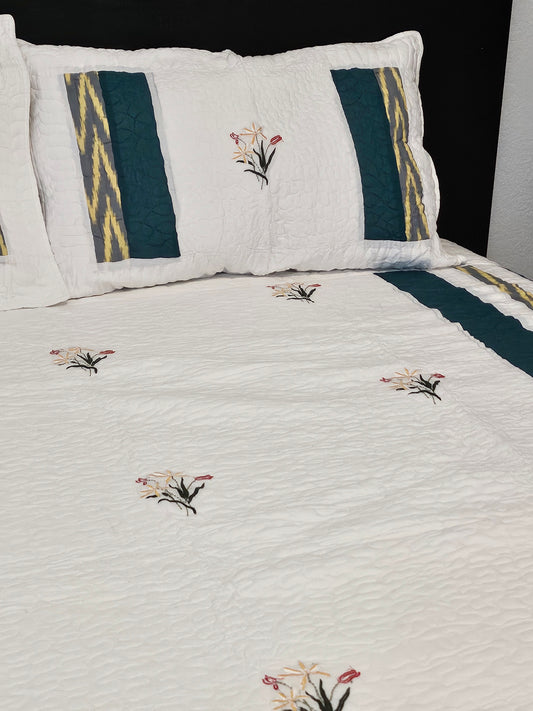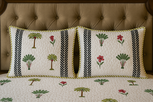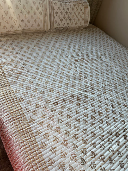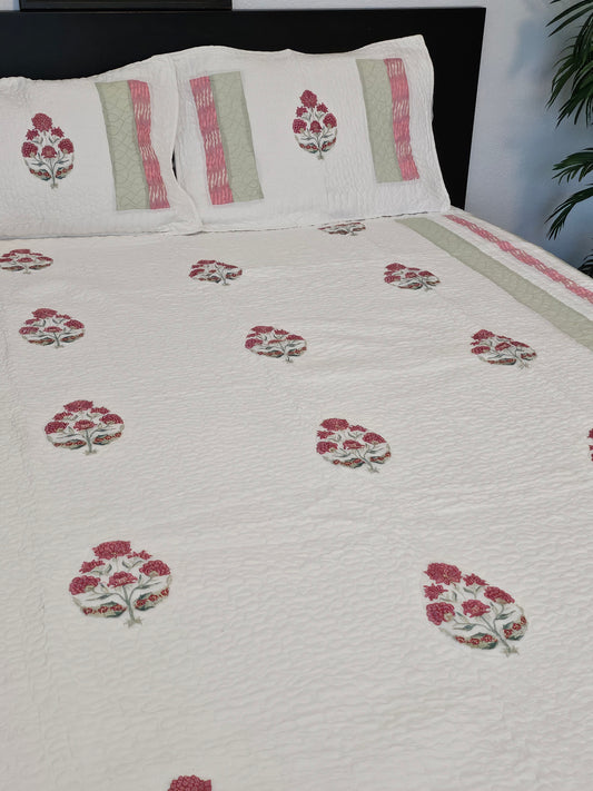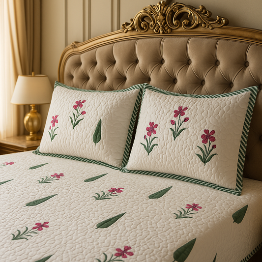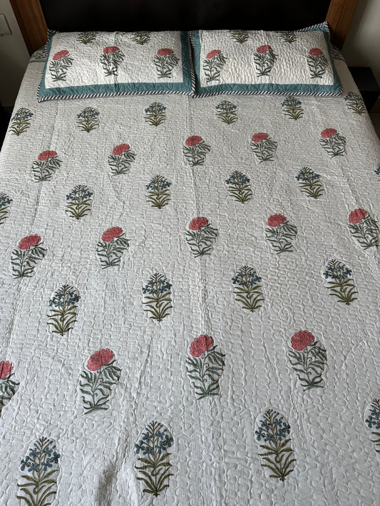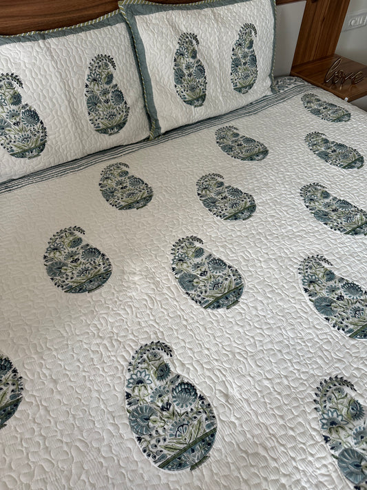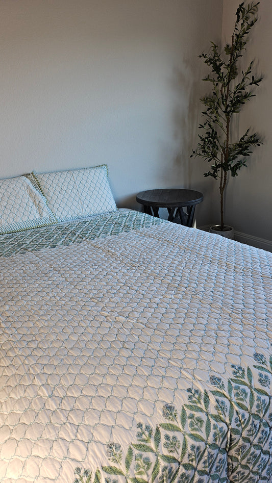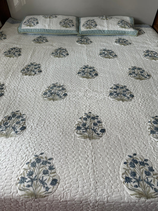 Wrap yourself in comfort with our exquisitely quilted bedspreads—crafted from breathable natural cotton, detailed with hand-done prints, and designed to add a soft, luxurious layer to your sleep sanctuary. Each set is suitable for King & Queen sizes. Comes with 2 matching pillowcases